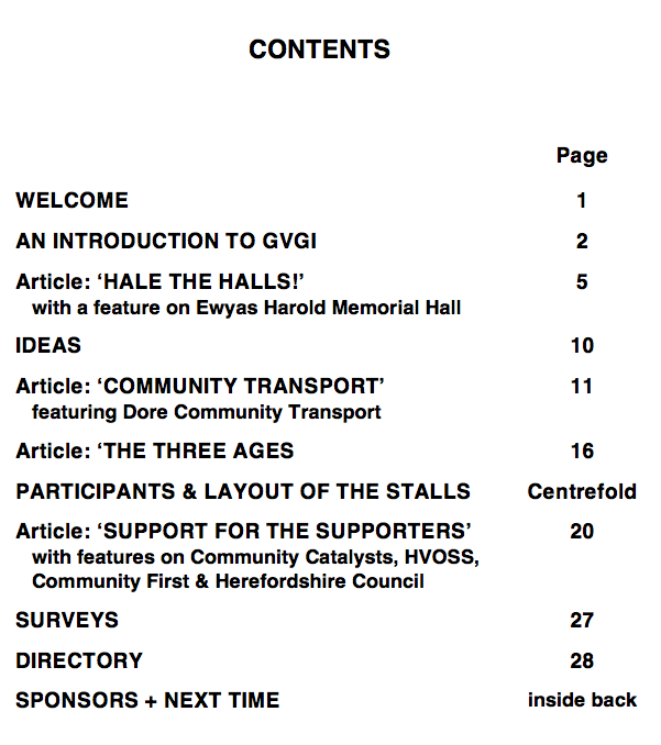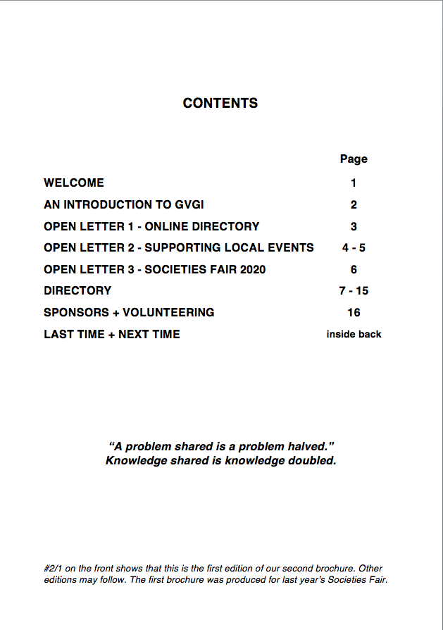 Our first brochure was produced to accompany our first Societies Fair which was held on 18th November 2018. As you can see from its Contents page, it included some information about what we were doing in general and about the Societies Fair in particular, some articles about some of the issues that concern us (in this case: Loneliness, for which 'The Three Ages' was relevant, and Community Transport), and some of the organisations we think people should be aware of (the Community Halls and those groups that 'Support the Supporters'). It is likely that future brochures will take a similar approach. |